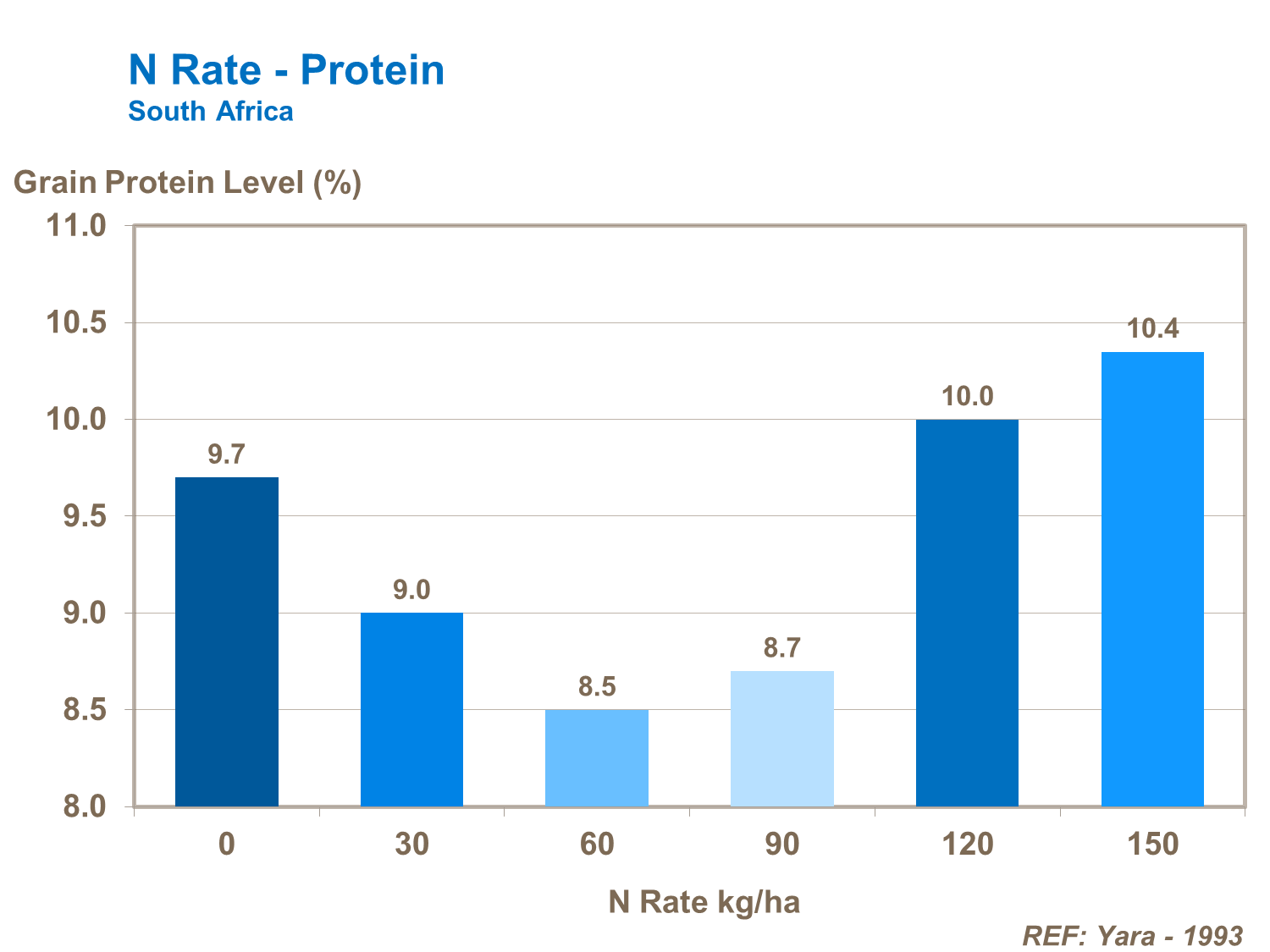 Poor nitrogen supply during grain fill leads to lower grain proteins. A balanced nitrogen topdressing during stem elongation can improve grain protein content and provide the right amount of nitrogen to sustain the grain corn filling.