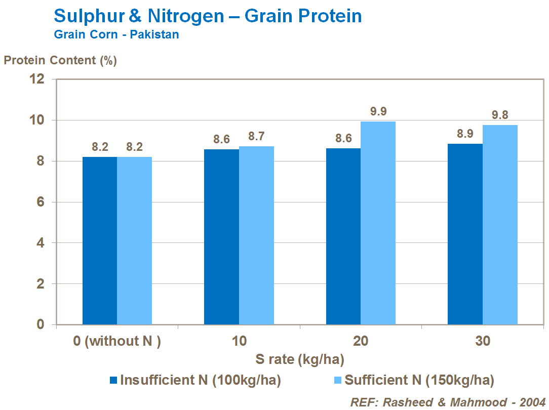 Sulphur supply is particularly important in the conversion of nitrogen to protein and in improving grain corn quality. S also helps in the process of amino acid production, ensuring high nitrogen use efficiency.