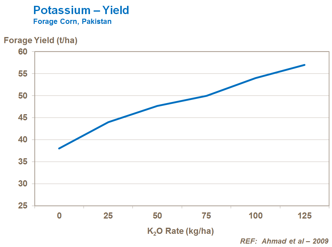 Trials commonly show large responses to high rates of potassium. Annual rates in most countries will range from 150 to 250kg K2O/ha. Corn requires potassium and nitrogen in similar quantities for high yields and low N application will reduce K uptake, restricting growth. A lack of potassium and phosphorus can lead to incomplete grain set at the point end of the corn cob.