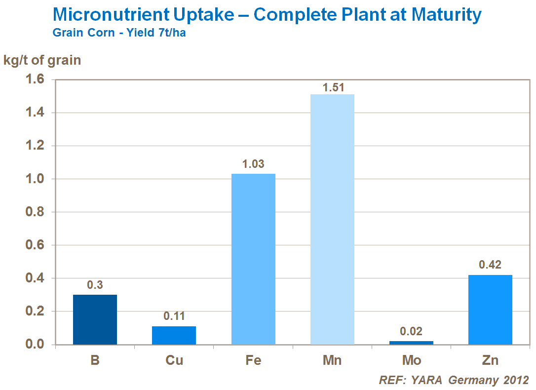 The key micronutrients taken up in greatest quantities are iron and manganese. These two micronutrients are also those which are lost in greatest quantities when the whole crop or straw is removed from the field. However, boron and zinc – which are the two most important micronutrients needed in relatively large quantities – are removed in greater quantities in the grain. It is increasingly common to apply zinc with the seed at planting to ensure good rooting and shoot development.