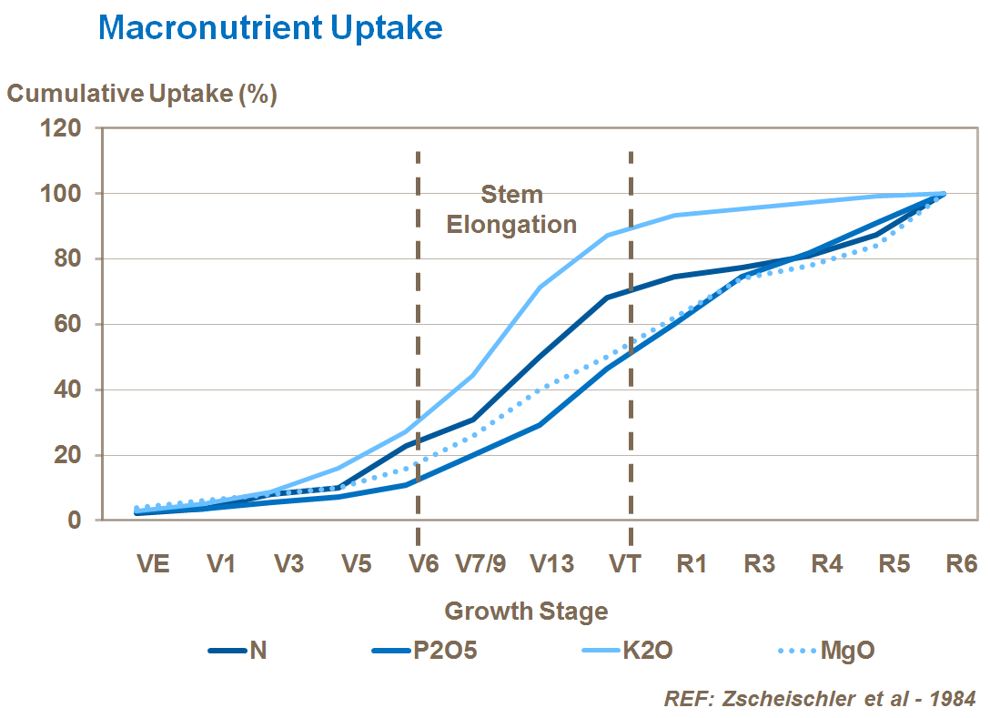 While the main period of nutrient uptake in corn is during stem extension or shooting (V6 to tasseling) unless centre pivot fertigation is practiced, fertilizer needs to be applied before this because crop height and density means it is difficult to enter the field with conventional machinery after this time.