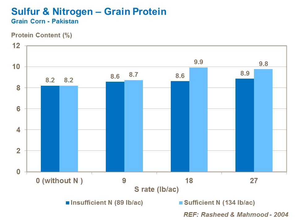 Sulfur supply is particularly important in the conversion of nitrogen to protein and in improving grain corn quality. S also helps in the process of amino acid production, ensuring high nitrogen use efficiency.