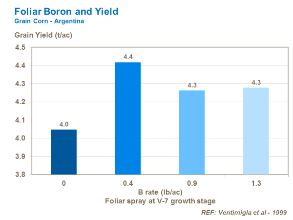 Boron is involved in cell extension and pollen tube growth; hence, it has a direct effect on grain set. A lack of boron can lead to a restricted grain set, with the cob having many missing kernels and a few large grains. Foliar or soil applied boron during stem elongation (V5 to V7) can contribute to higher grain corn yield.