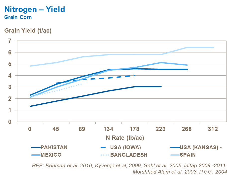 Nitrogen is essential for plant growth, being one of the main building blocks of proteins. In grain corn, the highest yields generally come from N-rates of 178 - 223 lb/ac. Rates need to be high enough to maximize plant growth. Lack of nitrogen results in short cobs with a low number of grains.