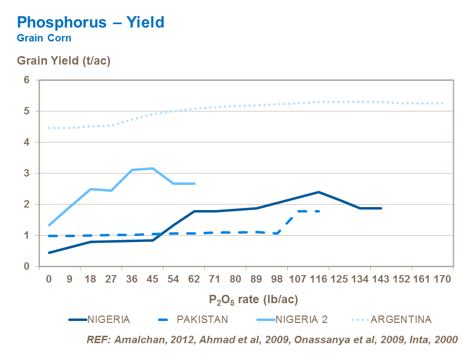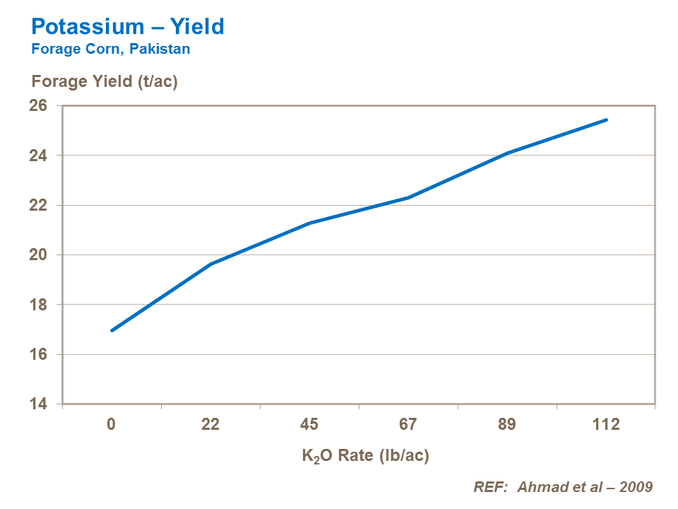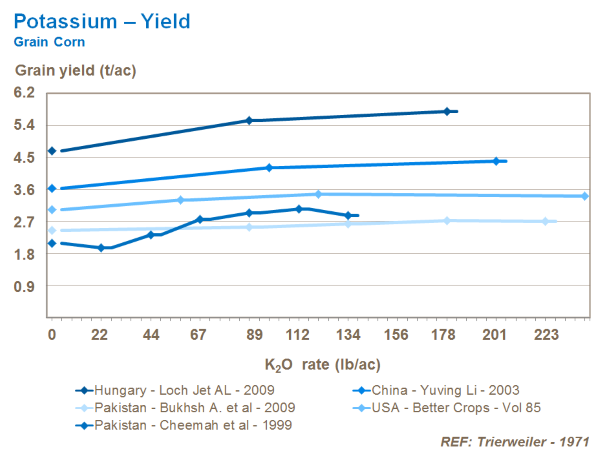 Trials commonly show large responses to high rates of potassium. Annual rates in most countries will range from 150 to 250kg K2O/ha. Corn requires potassium and nitrogen in similar quantities for high yields and low N application will reduce K uptake, restricting growth. A lack of potassium and phosphorus can lead to incomplete grain set at the point end of the corn cob.