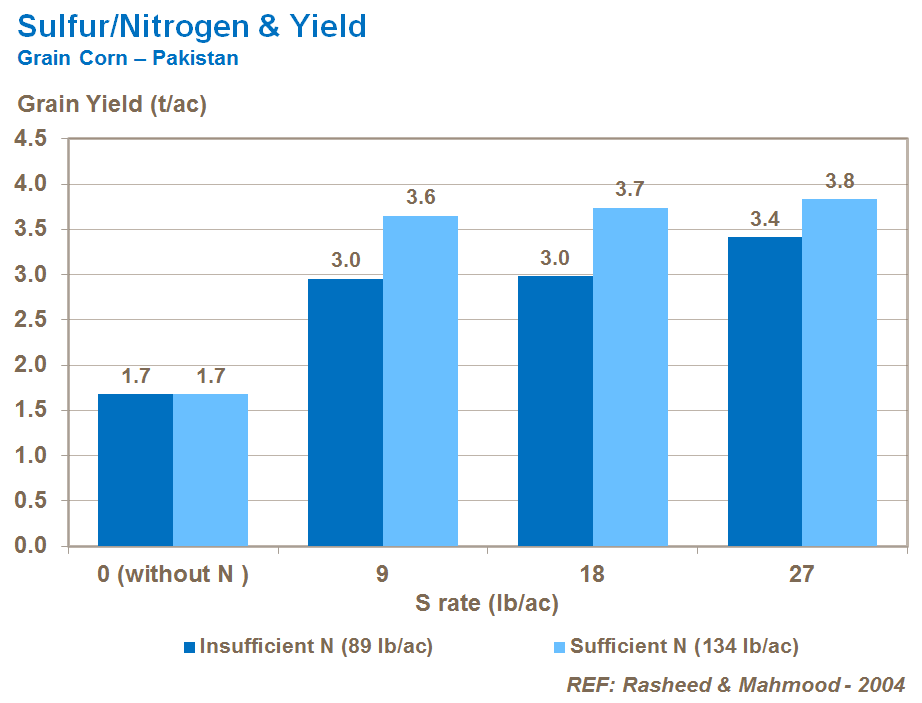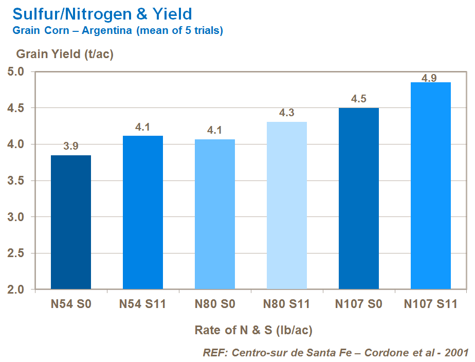 The following trials demonstrate the effects of sulfur and nitrogen on grain corn yield.
