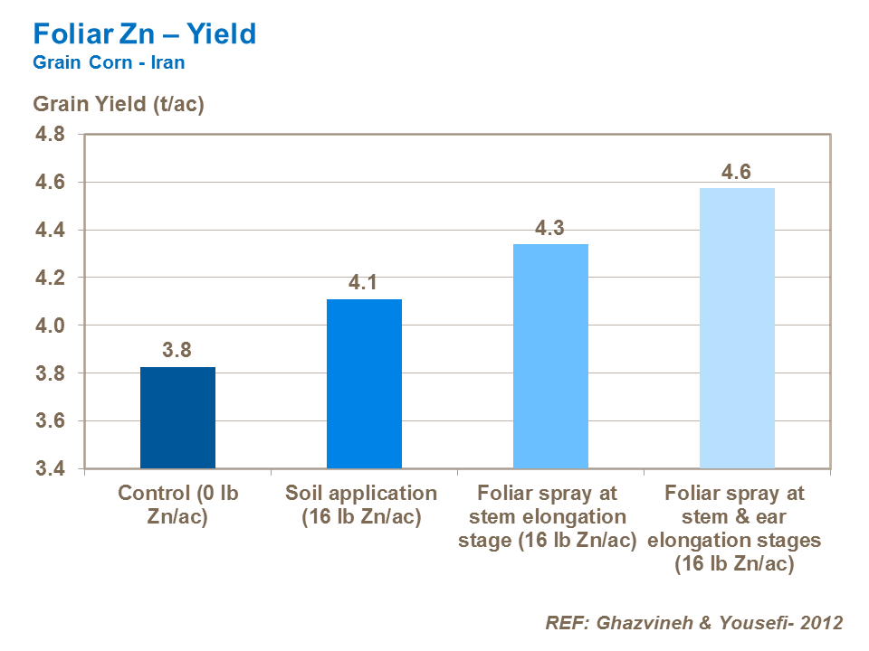 Corn plants are only slightly sensitive to lack of iron. Where deficiencies occur, foliar applications – particularly those made at later stages of leaf growth and at early stem extension – have been shown to increase corn yield.