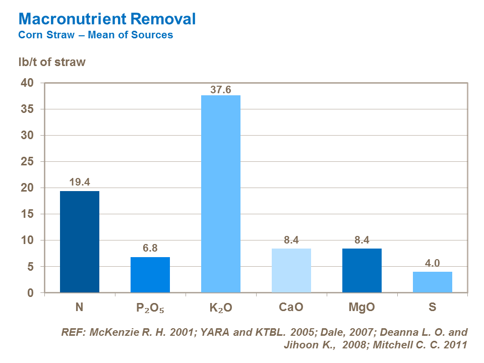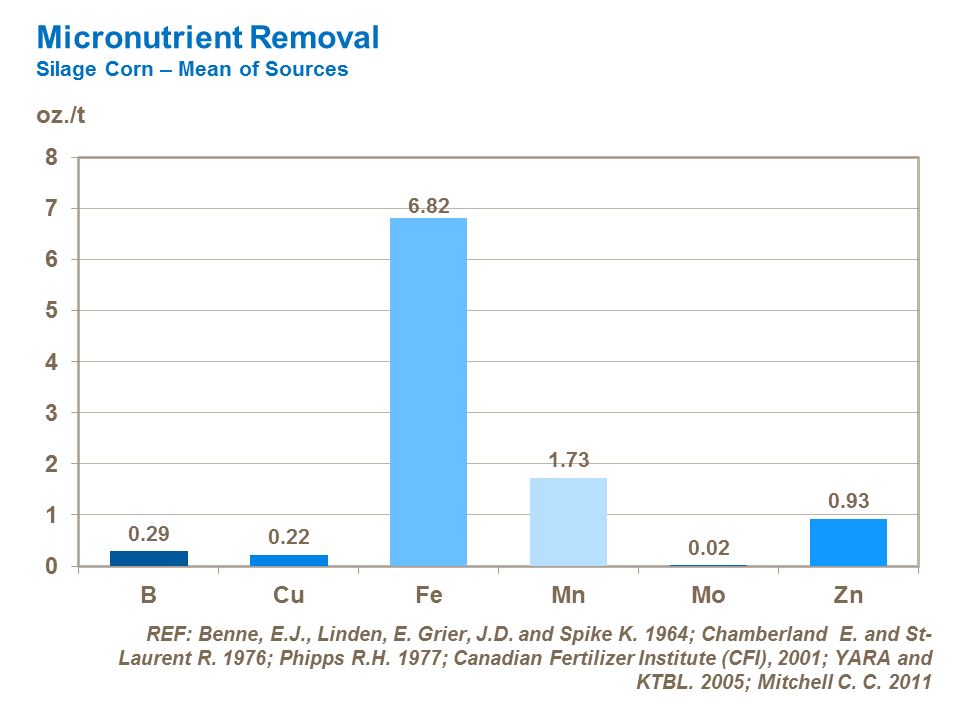 Uptake and removal figures vary according to the crop being grown. The difference in nutrient offtake between grain and silage corn needs to be considered when planning the nutrient program of the following crop. There may also be significant differences in nutrient utilization between varieties.