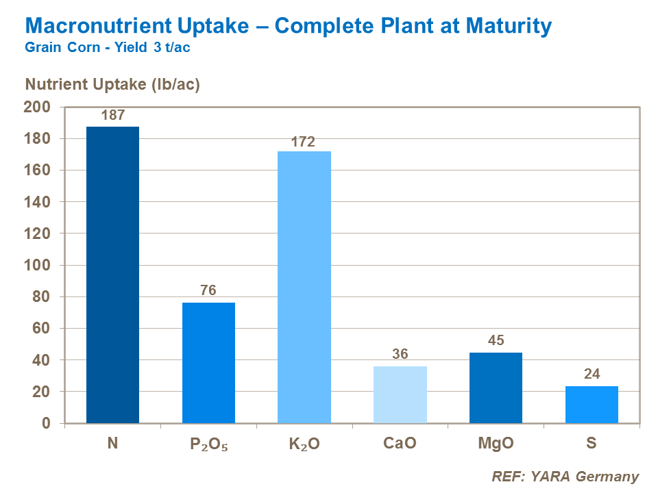 Potassium is needed in large quantities – at levels similar to those for nitrogen. Total crop uptake is around 200kg/ha. Most of this potassium is used in the leaf and stem and peak potassium-demand is during stem extension when uptake is faster than for any other nutrient. As a result, significant quantities are found in the stover and removed when the whole crop is ensiled. While lower amounts of secondary macronutrients are required – ranging between 25-50kg/ha for a 7t/ha grain corn crop - supplies of calcium, magnesium and sulfur are important to maintain corn yield.