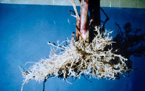 Root system shortened with brown and black necrosis