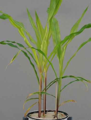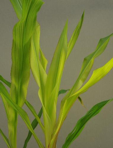 Plant shows stunted, erect growth. Seen from a distance, younger leaves are colored uniformly pale, but when you look at them closely, it's rather an interveinal chlorosis. The yellowgreen leaves show a narrow brown seam along the leaf margin.
